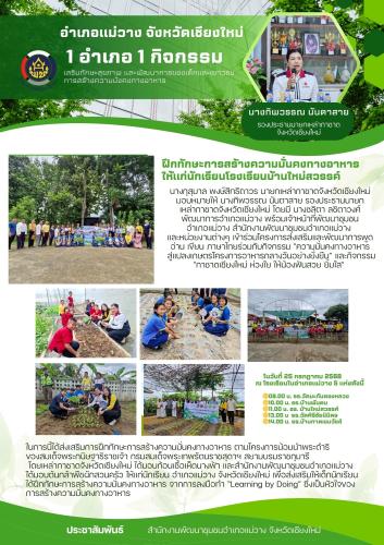 ในการนี้ได้ส่งเสริมการฝึกทักษะการสร้างความมั่นคงทางอาหาร ตามโครงการน้อมนำพระดำริ ของสมเด็จพระกนิษฐาธิราชเจ้า กรมสมเด็จพระเทพรัตนราชสุดาฯ สยามบรมราชกุมารี โดยเหล่ากาชาดจังหวัดเชียงใหม่ ได้มอบก้อนเชื้อเห็ดนางฟ้า และสำนักงานพัฒนาชุมชนอำเภอแม่วาง ได้มอบต้นกล้าพืชผักสวนครัว ให้แก่นักเรียนโรงเรียนบ้านใหม่สวรรค์ หมู่ที่ 7 ตำบลดอนเปา อำเภอแม่วาง จังหวัดเชียงใหม่ เพื่อส่งเสริมให้เด็กนักเรียนได้ฝึกทักษะการสร้างความมั่นคงทางอาหาร จากการลงมือทำ “Learning by Doing” ซึ่งเป็นหัวใจของการสร้างความมั่นคงทางอาหาร